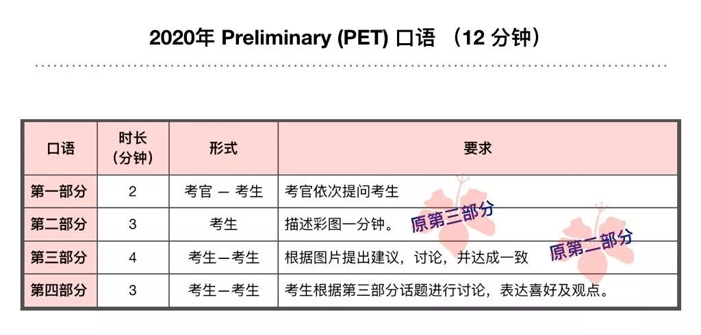 PET口語(yǔ)仍為四個(gè)部分,但是順序上做了些調(diào)整,即第二和第三部分做了對(duì)調(diào),第四部分是第三部分的話題延伸??倳r(shí)長(zhǎng)依舊為12分鐘。